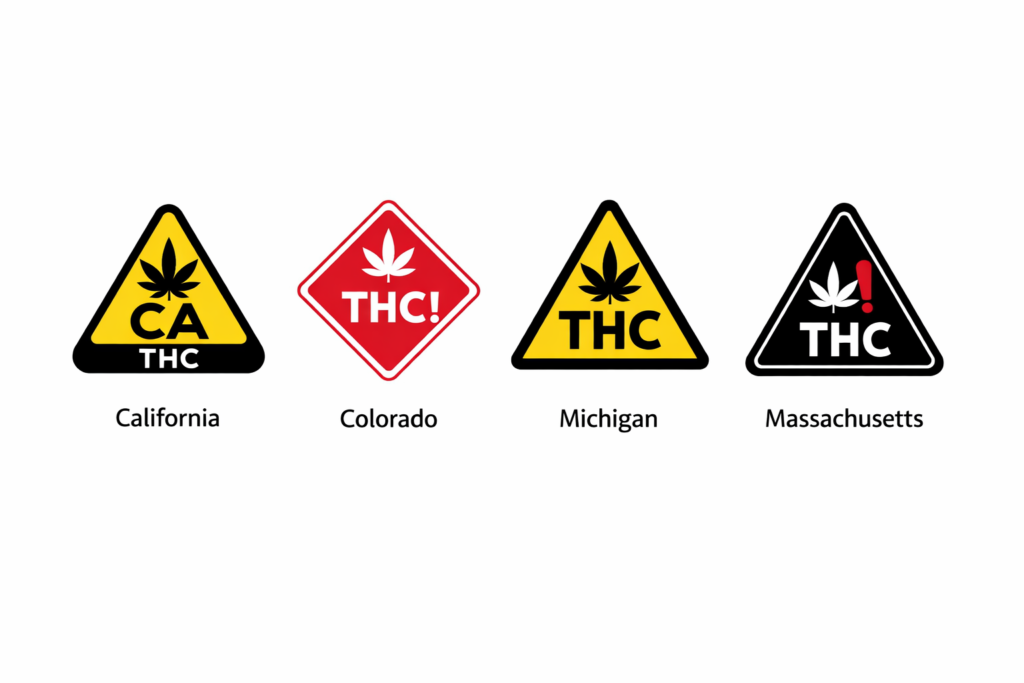 - Massachusetts: A red triangle containing a black cannabis leaf icon and text “CONTAINS THC”.